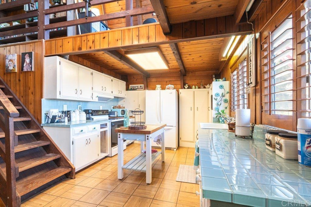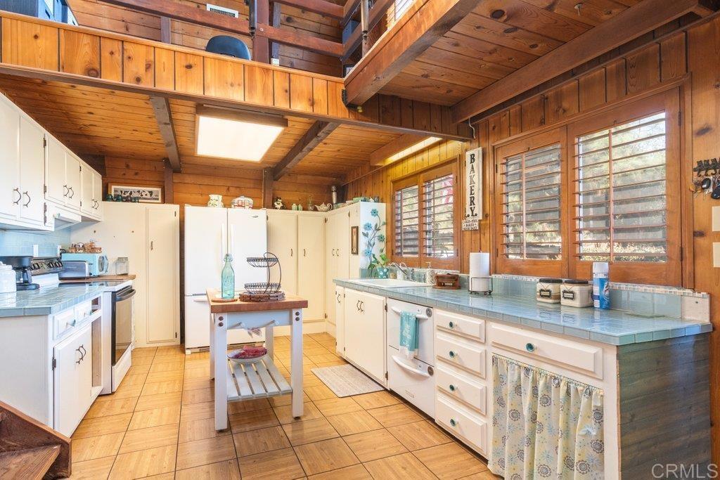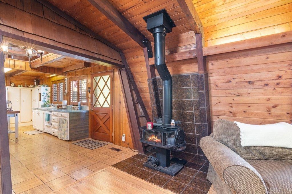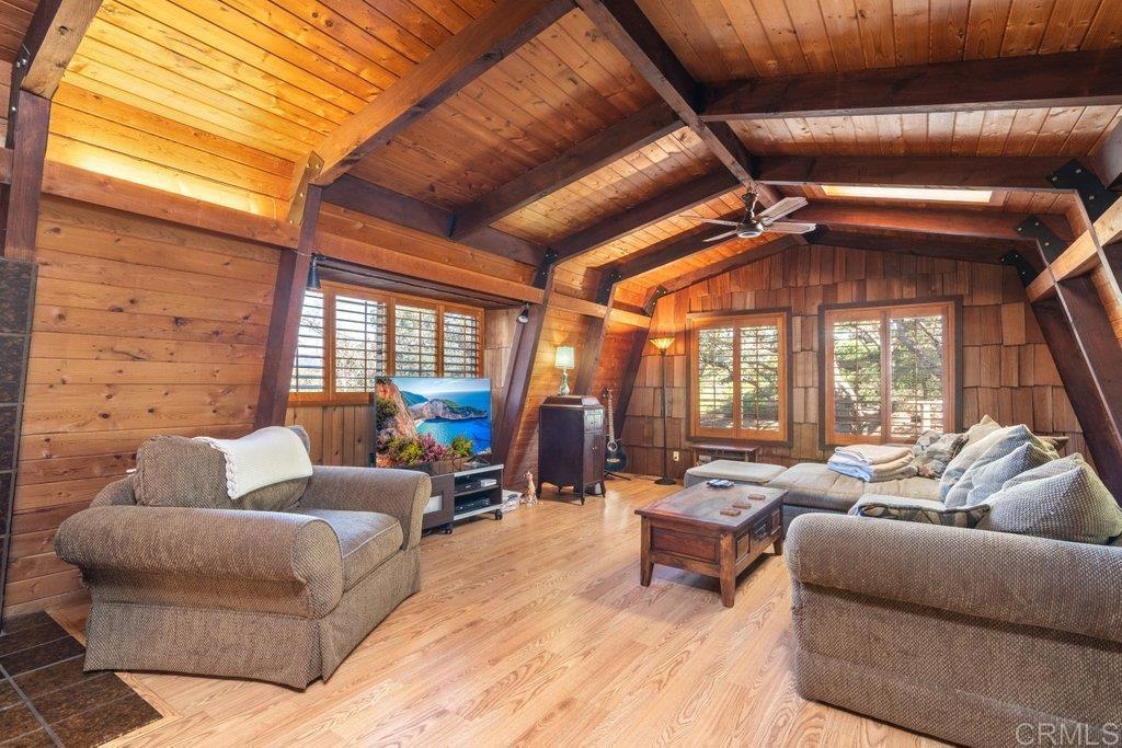 Rustic Fallbrook Haven on 1.58 conveniently located acres. You are welcomed by the expansive wrap around wooden deck, inviting you to enter this charming home. Inside you imagine the aroma of baked apple pie as you are enveloped by warmth created from an abundance of wood features and the free standing wood burning stove. The main bedroom is ideally located on the ground floor. Upstairs is the second bedroom, half bath, and office/library area. The charm is enhanced by wood walls, wood open beamed ceiling, bay windows with window seats, wooden shutters, glass tiled kitchen counters, and very spacious living room. In addition to this 1500SF home, the approx 200SF bonus room featuring wood open beamed ceiling and an abundance of windows expands your living and storage space. Feel like you live in a mountain chalet yet have easy access to town or the freeway. Come explore the joys of a simple life.