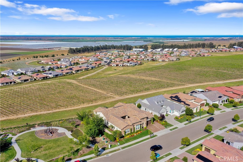 Stunning single-level Dolcetto model in Trilogy at Monarch Dunes, situated on a premier lot with unobstructed panoramic views of the ocean, coastal mountains, vineyards and the Santa Maria Valley. Enter a serene courtyard featuring etched concrete and built-in stone gas fireplace – A breezeway leads into the main living area, where high ceilings and an expansive open floor plan immediately showcase the breathtaking views. Inside, elegant finishes abound, including heated French limestone flooring and French oak ceilings with recessed lighting. The gourmet kitchen is designed with large granite countertops, dark stained cabinetry with custom hardware, a glass tile backsplash, a striking glass tile range hood, and walk-in pantry. A unique modification expands the traditional Dolcetto layout, adding approximately 53 square feet of versatile living space – ideal for a home gym, wine alcove, or creative retreat. The kitchen, dining area, and living room flow seamlessly together and open to the outdoor living space through a dramatic sliding glass wall. Step outside to a wraparound patio designed for both entertaining and tranquility, featuring Creme Fraiche pavers, multiple seating areas, a built-in hot tub with wood trim, planters, a gas firepit, and a dry sauna. Back inside, the living room offers a refined atmosphere with a quartzite gas fireplace, chandelier and continued French oak ceiling detail. The dining room is equally impressive, featuring a sleek dining table with a hidden pool table, elegant lighting and acoustic wall treatments. The owner’s suite is privately situated and offers stunning views, heated marble flooring, and crown molding. The spa-inspired bath includes a soaking tub, dual vanities, a glass-enclosed shower with full height recycled glass tile, marble flooring, quartz countertops, and a large walk-in closet with direct access to the laundry room. Additional spaces include a powder room, dedicated office with French oak flooring, and crown molding, as well as two guest bedrooms – each with custom closets and ensuite bathrooms featuring upscale finishes. Additional highlights include – Golf cart garage with expanded driveway / Custom attic storage access / Solar system / Landscaped side yard / remote-controlled patio sunshade / Slatwall garage system and more. This is a rare opportunity to own a thoughtfully upgraded home that perfectly blends luxury, comfort and breathtaking Central Coast views.