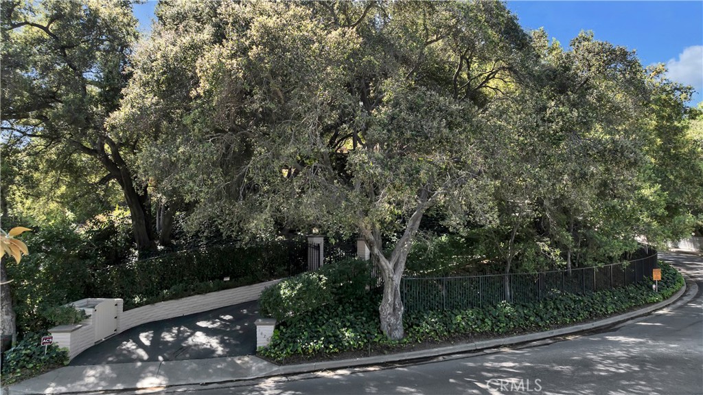 First time on the market in 50 years, this gated property offers the ultimate in privacy and is located in the highly desirable Lanai Road School District. The driveway winds through a forested lot of nearly 20,000 square feet, surrounded by graceful oak trees, olive trees, and other mature landscaping, and leads to a charming gated courtyard with a fountain. The single-story Mid-Century home features 3 bedrooms and 2.5 bathrooms. The living room showcases a French limestone fireplace, a wall of windows topped with clerestory windows, a beamed ceiling, and built-in bookcases, creating a bright and inviting space. The kitchen is appointed with granite counters and a Sub-Zero refrigerator/freezer. Hardwood floors run throughout most of the home, with carpeting in two bedrooms. The dining room features expansive wine-refrigerated closets and French doors that open to a covered patio with a spa/fountain finished in Pebble Tec plaster—perfect for indoor-outdoor entertaining. The primary suite offers an updated marble bathroom with dual vanities, a separate shower, and a soaking tub. A secondary bedroom is en suite with an updated three-quarter bathroom, while the third bedroom has been converted to an office with built-in desk and bookcases. Additional amenities include speakers throughout, a security system with cameras, a powder room off the foyer, and a laundry room with sink. A detached accessory room with speakers and air conditioning—currently used as a gym—adds flexible space to this special property.