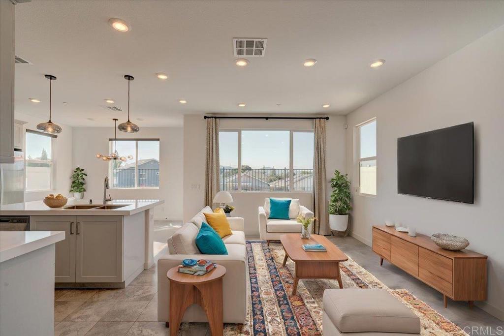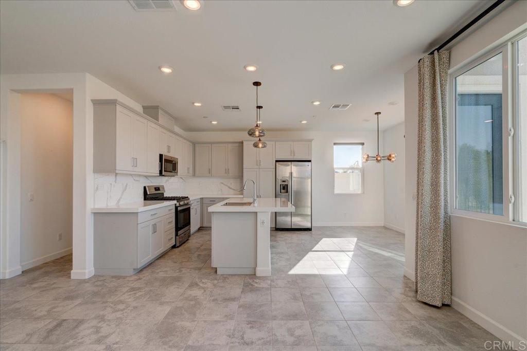 This stunning 2021-built home, complete with paid solar, is nestled in the highly desirable Canopy Grove community of Escondido. Located at the end of a cul-de-sac with no neighbors directly behind, the property offers serene westward views and features drought-tolerant landscaping, a turf lawn, and a cozy back patio. The spacious kitchen is a dream for cooking and entertaining, with abundant cabinet space, a large island with a deep sink, a gas range, stainless steel appliances, and custom lighting over both the island and dining area. The expansive family room, adorned with tile flooring and filled with natural light, provides a welcoming and comfortable space. Upstairs, there are three generously sized bedrooms and a versatile loft, perfect for a home office, playroom, or relaxation area. Additional features include a two-car garage, solar power, and low HOA fees. Conveniently located just steps from a park with a playground, this home grants access to numerous HOA amenities, including a pool, spa, multiple playgrounds, walking trails, a dog park, and a fitness center. Combining modern comforts with a peaceful, community-centered lifestyle, this home is an ideal choice for those seeking tranquility and convenience in North County.