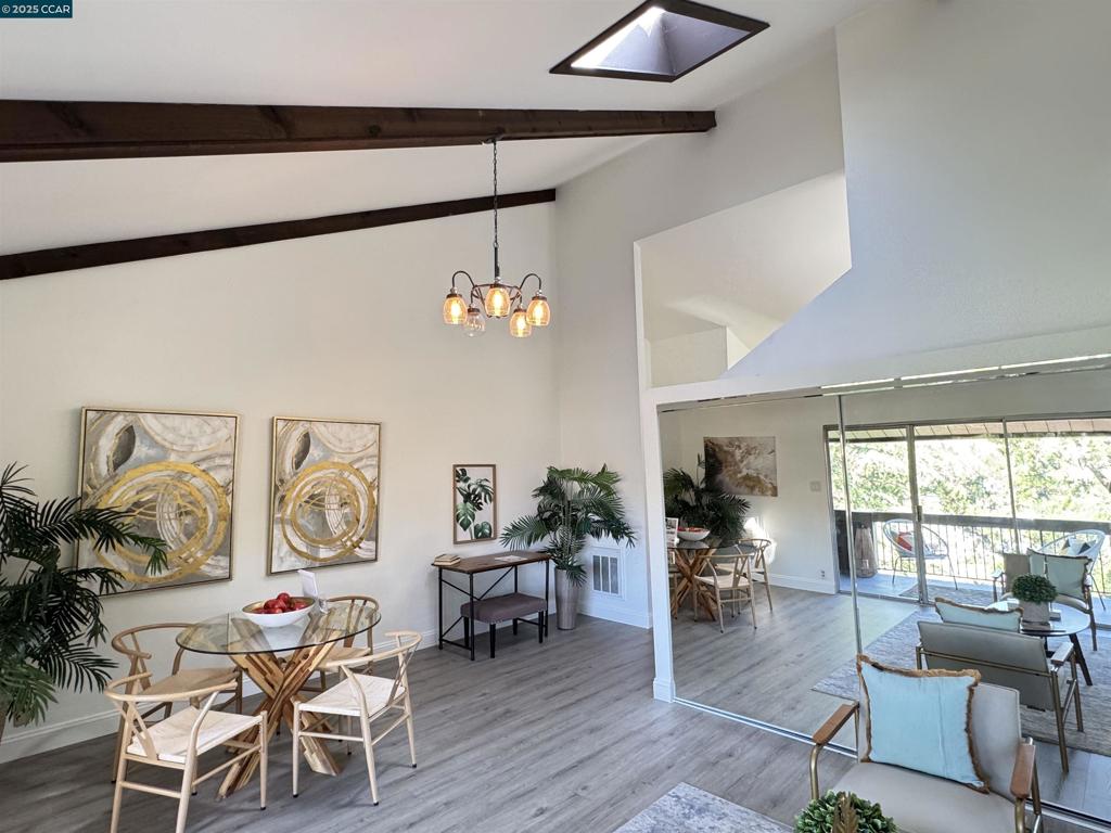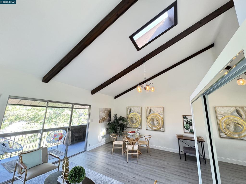 One block from shopping, resturants, theatre, Starbucks, and transportation. move in to this super sharp 3bed/2bath single story condo with vaulted ceilings. Freshly painted interior, wood flooring throughout. Kitchen and hallbath have been updated. Large primary bedroom with remodeled bath. Lots of natural light and beautiful mountain views from primary bedroom, living room, and large patio. Extra attic/storage area added above hallway with flooring and electricity. Owner pays hot/cold water & trash removal. One assigned covered space and one permit pass for guests or second car. Community pool and clubhouse. Community laundry is just a few steps away from the front door.