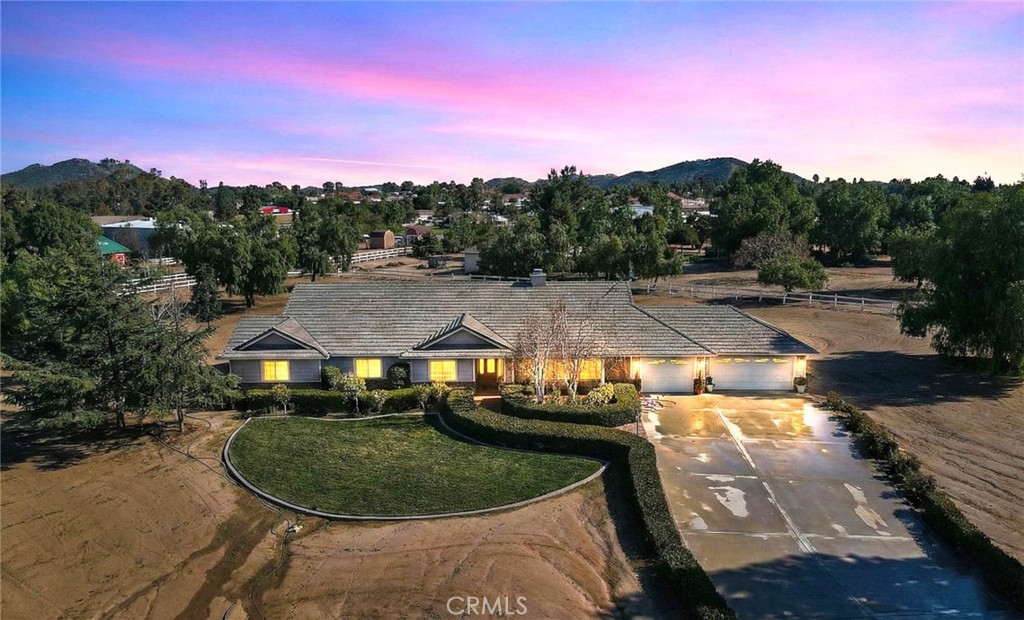 **PRESTIGIOUS RANCH ESTATE ON 2.14 ACRE** LAKE MATHEWS/GAVILAN HILLS.*NO HOA**LOW PROPERTY TAXES** This offering includes a 4 bedroom, 4 bathroom 2755 square foot ranch home with a 3 car garage on 2.14 acres. The impressive curb appeal with a gazebo in the front, surrounded by white two rail vinyl fencing will draw you into this single level ranch home situated in a luxurious estate neighborhood. The property has all of the amenities of a home in town but with the quiet serene surroundings of the beautiful countryside, and just down the road from the 325 acre Hartford Springs Reserve Nature Park. The quiet evenings and impressive sunsets will quench your desire to live in the country, and yet only minutes to restaurants and entertainment. The property also includes a 3 car garage with direct access, a covered front porch, and a covered back patio that accesses your backyard lawn while opening up to the balance of the 2.14 acres. In addition there is a water well on the property that may be used for your irrigation. You have plenty of room to build a workshop, a swimming pool, and an additional dwelling unit (ADU). This is the most sought after neighborhood in the Lake Mathews / Gavilan Hills area AND this is one of the few homes in the area that has NO HOMEOWNERS ASSOCIATION and NO MELLO ROOS. **MILES OF TRAILS FOR HIKING AND HORSE RIDING**