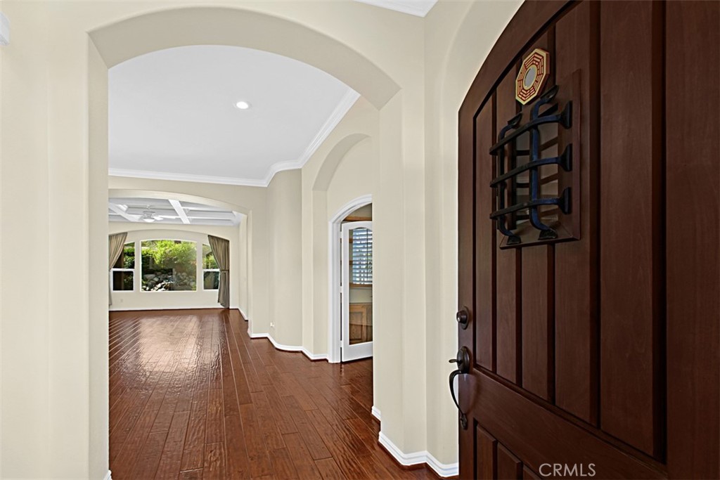 Welcome to Trilogy at Glen Ivy. An active 55 plus community at the base of the Cleveland National Forest and surrounded by the world famous Glen Ivy Golf Course. This Laguna Floor Plan is Stunning with 2 bedrooms a den and 2 baths. A Beautiful gated Flagstone entry welcomes you inside your private paradise. Engineered wood flooring throughout the home. Looking out the Great Room Picture Window is a Gorgeous Stone Waterfall surrounded by lush mature landscaping. The Ceiling of the Great Room Features a Tray Ceiling with Custom Wood Beams. Custom Wall Colors and Custom Window Coverings throughout. The Open Kitchen features granite counters with full backsplash, newer Stainless steel sink, Reverse Osmosis and newer refrigerator. Sunny breakfast nook and breakfast bar open onto the large open Great Room. There is a large separate dining room with a dramatic skylight. Featuring curved walls and arched doorways throughout the home. The Primary bedroom has Custom Wall Treatments and a sliding glass door to enjoy your Peaceful Private Oasis. Primary bath shower has newer non slip Pebble Tech flooring and a fabulous Custom Closet Organizer. Separate Laundry Room with newer Washer and Dryer. 2 Car Attached Garage with plenty of storage and PAID SOLOR! Recently refurbished Lodge and ballroom which is the hub of activities. Large Amphitheatre for summer concerts under the stars! 4 tennis courts, pickle ball, bocce ball, cards, billiards room, dances, dinners, ceramics, painting, glass fusion, a travel club, wine clubs, complimentary WI-FI and much more! Life begins at 55!