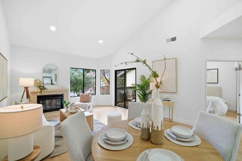 Gorgeous Top Floor Penthouse condo with stunning vaulted ceilings! All prepped for you with new paint (no popcorn ceiling) and wide plank laminate floors. Enjoy an open kitchen with quartz counter top that seamlessly connects kitchen, dining and living space (watch TV from kitchen 🙂 Inside laundry, AC, refrigerator, wood burning fireplace, lots of big windows. Gated community and 2 secure underground parking spaces. Great location in North Santa Clara for easy access to Tech companies. Also walking distance to grocery story and 24 hour Fitness. Vaulted ceilings are rare. Great perk of Low Santa Clara utilities. Electricity does not come from PGE.