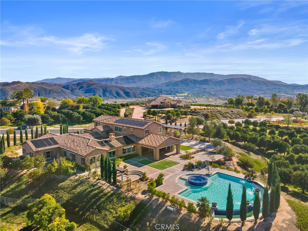 Set behind the prestigious gates of The Groves, this breathtaking 6-bedroom, 6.5-bath Tuscan-style estate embodies the perfect blend of timeless European elegance and modern Wine Country living. Located in the heart of Temecula Wine Country and surrounded by an active, certified organic citrus orchard, the 2.12 acre property offers uninterrupted vistas of rolling groves, vineyards, and glowing sunsets. Olive trees line the streets that lead to the residence, where rich architectural details and refined craftsmanship define every space. Inside, each bedroom enjoys the privacy of its own en suite bathroom, while the primary suite serves as a private retreat complete with a sitting area and a dedicated home gym. The gourmet kitchen features premium Viking appliances, complemented by a wine cellar, formal dining room, and multiple indoor/outdoor living areas ideal for entertaining. An airy atrium brings soft natural light into the home’s core, enhancing its warm, inviting ambiance. Luxury and convenience come standard with paid solar, a whole-home generator, solar pool heater, water softener, reverse-osmosis drinking system, under-counter ice maker, under-counter freezer, custom shutters/blinds, and ceiling fans throughout. The resort-style backyard showcases a sparkling pool and spa, framed by panoramic views of citrus orchards and stunning sunset views. A private casita provides flexible space for guests or multigenerational living. Car enthusiasts will appreciate the expansive 5-car garage, offering ample room for vehicles, storage, or a workshop. Blending Tuscan character with modern sophistication, this exceptional estate captures the essence of luxury Wine Country living within one of Temecula’s most coveted gated communities.