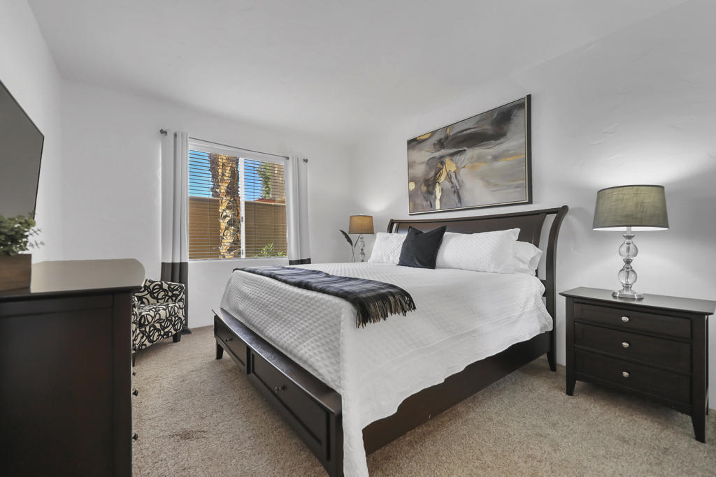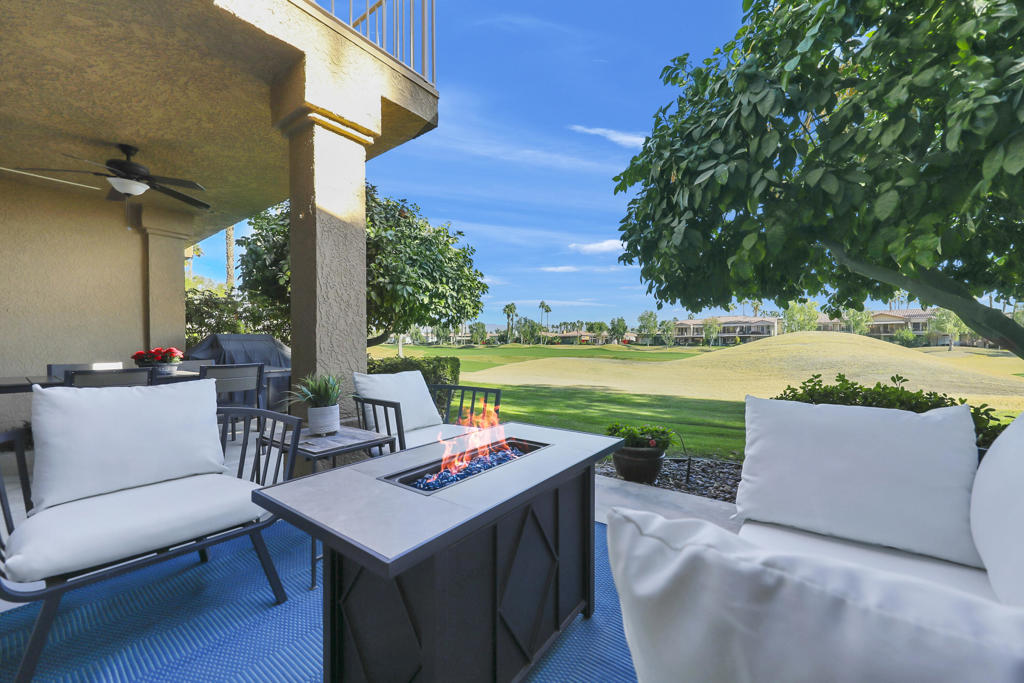 The perfect seasonal retreat. Thoughtfully designed with a clean, contemporary aesthetic, this home highlights amazing design features throughout and is move-in ready for immediate enjoyment. This 2-bedroom, 2-bath condo features a light and open layout highlighted by a full wall of sliding glass doors that open to the covered outdoor patio–designed to maximize natural light and capture the stunning fairway views. The inviting living spaces flow seamlessly to the outdoors, creating the perfect setting for relaxed desert living during the winter season. The gourmet kitchen is designed for both style and function, complete with stainless steel appliances, a newer LG refrigerator, and seamless access to the patio for easy indoor-outdoor living. Two spacious primary ensuite bedrooms provide ideal privacy and flexibility for hosting guests or family, making this home as comfortable as it is versatile.Fresh, updated decor throughout creates a clean, modern feel, while the new AC adds peace of mind for year-round comfort. Additional features include a private laundry room and a two-car garage with generous storage–perfect for seasonal use.Step outside and enjoy mornings, afternoons, and sunsets overlooking championship golf–ideal for entertaining guests or simply unwinding after a day on the course. Situated on the 5th hole of the Jack Nicklaus Tournament Course, enjoy world-class golf views directly from the patio, making it an exceptional setting during the American Express Tournament. Embrace the convenience of being just steps from the community pool, perfect for warm afternoons, and unwind in the evenings by the firepit. Whether used as a winter getaway, full-time residence, or lock-and-leave retreat, this home delivers the best of desert golf living with unparalleled views and access to world-class amenities. Move right in and enjoy the entire season in style and comfort. PGA West community amenities include exterior maintenance, cable TV, internet, trash service, 24-hour security, and access to multiple community pools. A rare opportunity to own a seasonal escape with unforgettable tournament and fairway views in one of La Quinta’s most sought-after golf communities.